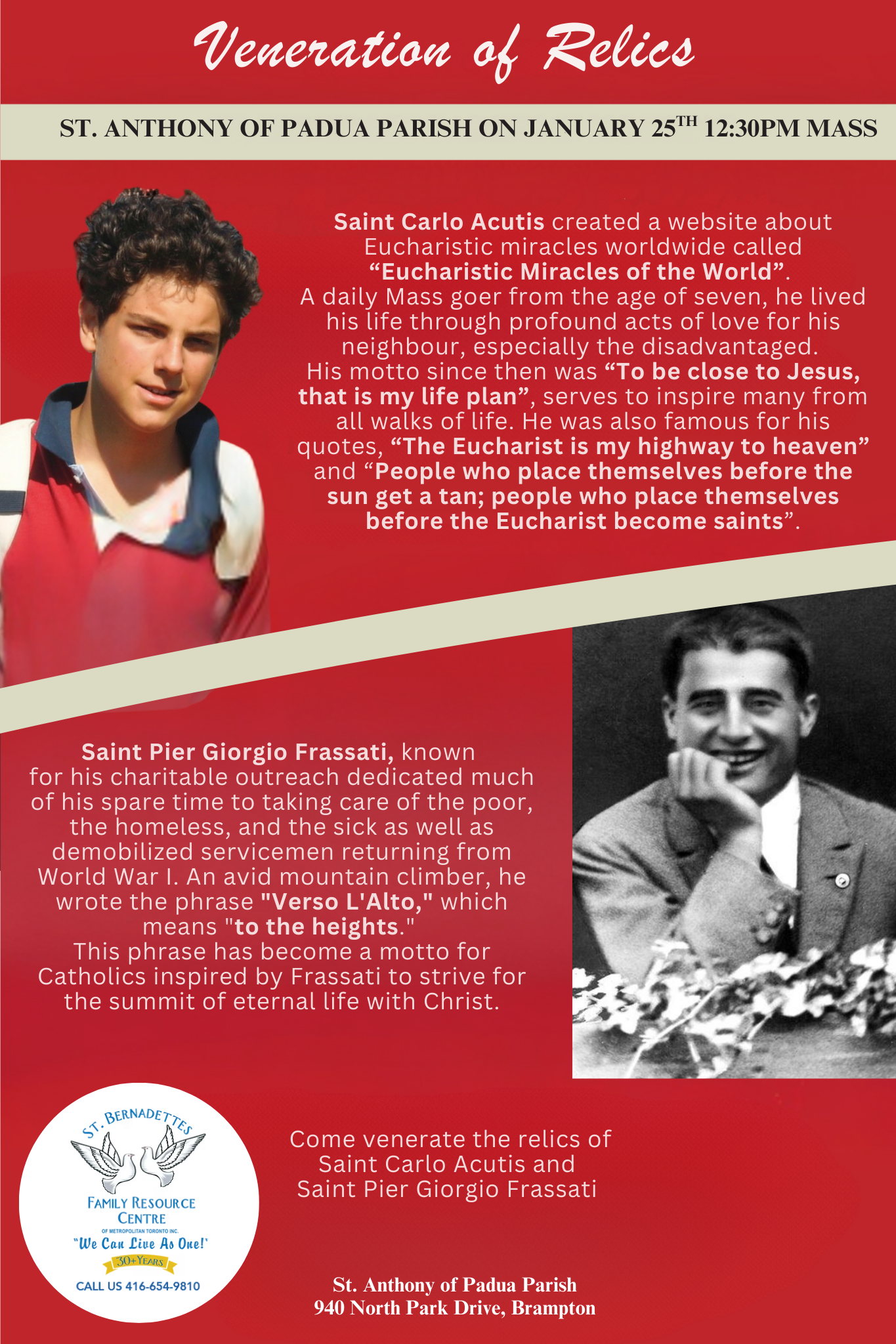 You are warmly invited to come and venerate the relics of St. Carlo Acutis and St. Pier Giorgio Frassati.